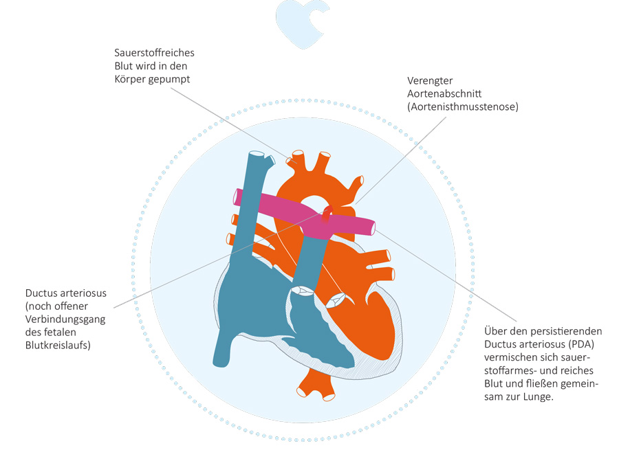 Je nach Schweregrad der Verengung kann es nach der Geburt, wenn sich der Ductus Arteriosus verschließt, zu einem lebensbedrohlichen Zustand kommen. Denn dann wird unter Umständen die untere Körperhälfte mit den Organen wie Leber und Nieren nicht mehr genügend mit Blut versorgt. Außerdem wird die linke Herzkammer durch das dauerhafte Pumpen gegen einen Widerstand übermäßig belastet und es droht eine akute Herzinsuffizienz. Die Symptome der meist neugeborenen Kinder reichen dann von vermehrtem Schwitzen, beschleunigter Atmung und Trinkschwäche bis hin zu schockartigen Verfallszuständen.