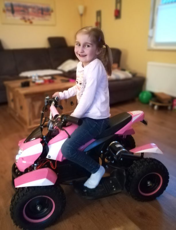 Mittlerweile ist Zoe sieben Jahre alt. Durch ihren Herzfehler ist sie in ihrem Alltag sehr eingeschränkt. Mehr als ein paar Minuten am Stück kann sie nicht gehen. Nach dem Treppensteigen bekommt sie kaum Luft und muss sich ausruhen. An Toben ist nicht einmal zu denken, denn sie gerät sehr schnell aus der Puste. Ein bisschen kindlicher Übermut könnte für Zoe direkt lebensgefährlich werden. Aber dafür flitzt sie mit ihrem Kickroller durch die Siedlung. Für längere Wege hat sie ihren roten Reha-Buggy. Die neueste Errungenschaft in Zoes „Fuhrpark“ ist das pinke Elektro-Quad. Darauf sind sogar die Jungs aus der Nachbarschaft neidisch.