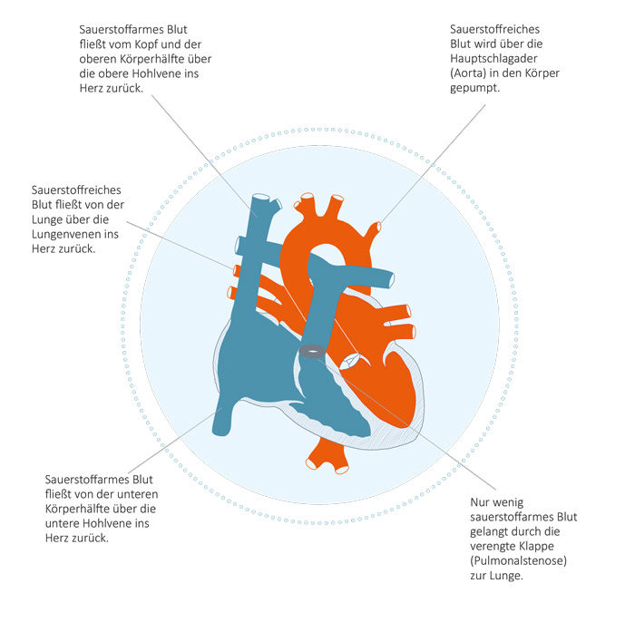Die Pulmonalklappenstenose (PS) gleicht in Diagnose und Behandlung der Aortenklappenstenose. Hier sind jedoch die Taschen der Lungenschlagaderklappe, die die rechte Herzkammer mit der Lungenschlagader verbindet, teilweise miteinander verschmolzen und können zusätzlich verdickt sein. Fünf bis sieben Prozent der angeborenen Herzfehler entfallen auf die Pulmonalklappenstenose . Bei leichter Ausprägung sind die Kinder meist beschwerdefrei; in schwereren Fällen entwickeln sie unter körperlicher Belastung Atemnot oder Blausucht.